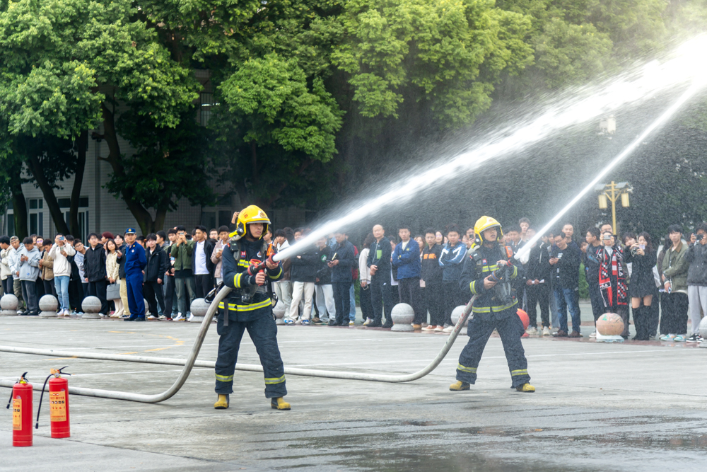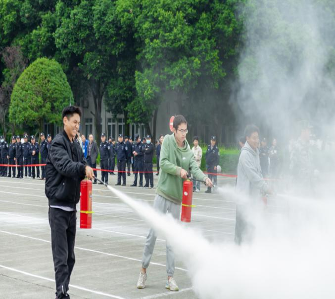 讲座结束后,温江区科兴东路消防救援站的指战员们在博学馆广场向师生们展示了在火灾救援中穿戴的防火服、使用的切割机、液压钳等消防装备以及水龙带操练,通过装备和技能展示,让同学们真正近距离了解消防员的日常救援工作。在展示结束后,教官着重向现场师生讲解了便携式灭火器的正确使用方法及注意事项,师生们按照“一提、二拔、三握、四压”的操作步骤,逐一进行了明火扑灭实战演练。师生们操作规范,灭火迅速,达到了预期目标。